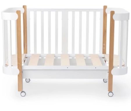 - Дизайн: стильные ножки с декоративным наклоном придают кроватке лёгкость и индивидуальность. Внутри скрыты колёса с тормозами для удобного перемещения.