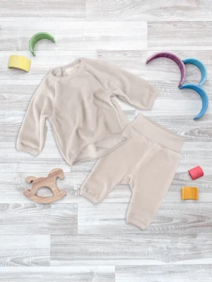 Велюровый комплект Mjolk [мьёльк] – детский костюм, выполненный из тёплого хлопчатобумажного велюра с небольшой добавкой синтетической ткани, которая придаёт изделию прочность. В комплект входит кофточка с длинным рукавом и штанишки с обработкой кашкорсе. Широкий пояс велюровых штанишек с резинкой надежно удерживает их на животике. Комфортно носить даже во время подвижных игр.